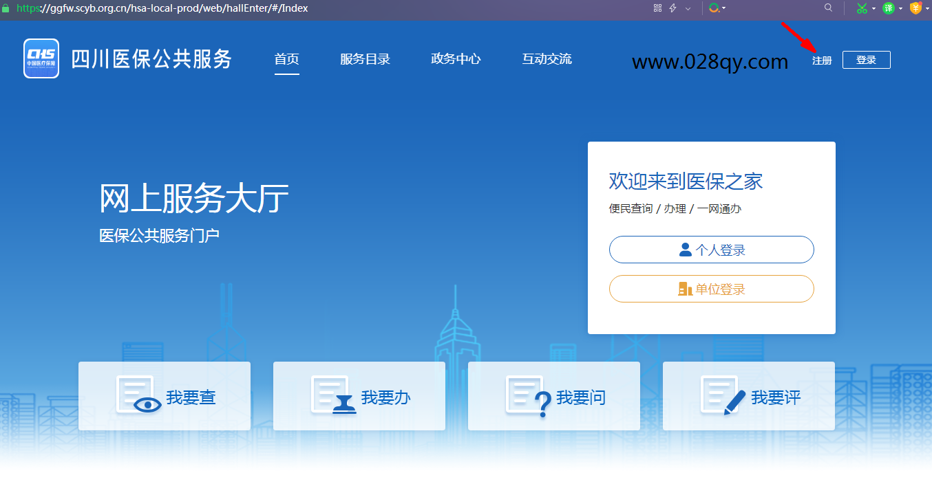 二、开始注册,如下图箭头所示,点击注册后会有个人注册和单位注册两个,点击单位注册。