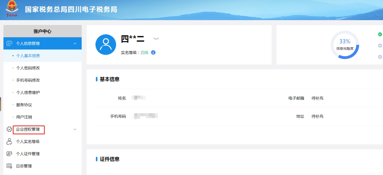 个人在登录电子税务局后,请务必通过“账户中心-个人基本信息”查看本账户所绑定的手机号,确保该手机号为关联原代办企业的手机号。如果本账户尚未绑定手机号码或手机号不正确,可通过手机号码修改功能进行添加。